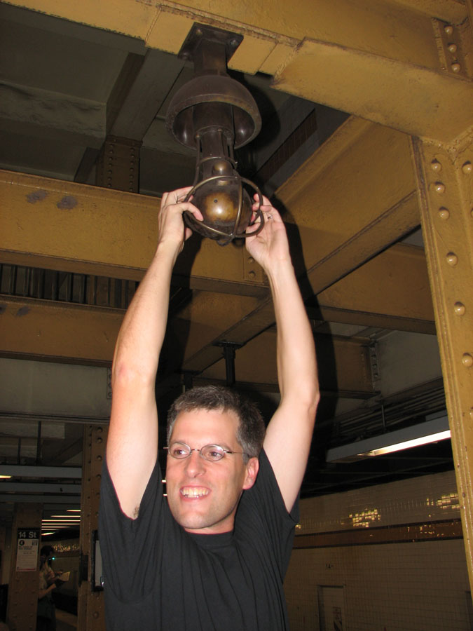 Chad hands from a piece of bronze subway art that looks like a light bulb with a face on it